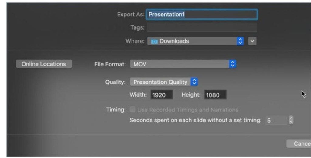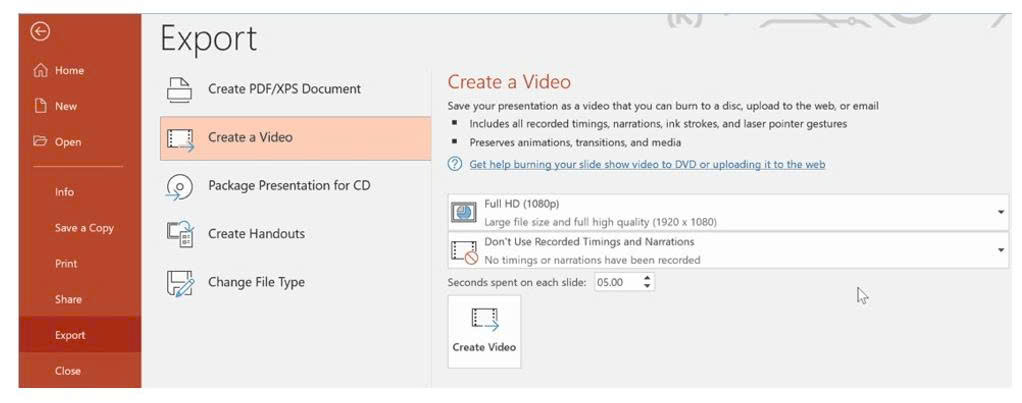 Ngoài ra, nếu bạn muốn duy trì mọi thứ (hoạt ảnh, chuyển tiếp, phông chữ, media…) trong bản trình chiếu của mình. Đi tới menu File > Export > Create a Video và chọn chất lượng video xuất ra mà mình mong muốn.