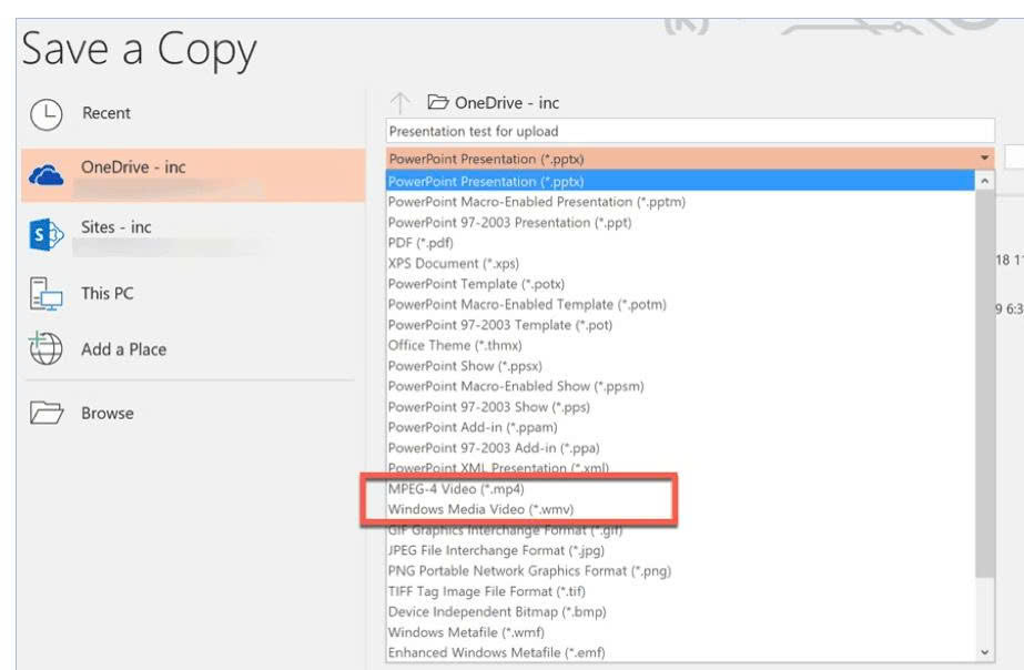 Truy cập menu File > Save As. Từ menu xổ xuống của mục File Type, bạn có thể chọn lưu bản trình chiếu PPT dưới dạng MPEG-4 hoặc Windows Media Video, tùy theo nhu cầu. Sau cùng bấm nút Save.