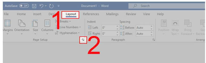 Chuyển qua tab Layout > Nhấn vào icon setup ở mục Page Setup.