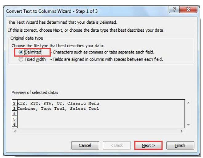 Trong hộp thoại Convert Text to Columns Wizard đầu tiên, chọn Delimited, nhấn nút Next.
