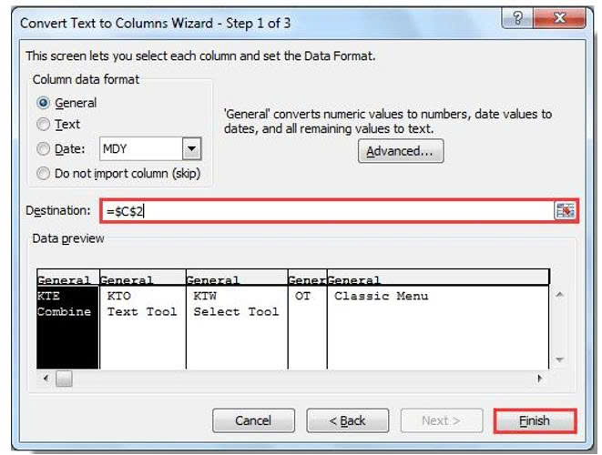Trong hộp thoại Convert Text to Columns Wizard cuối cùng, chọn một ô tính đặt giá trị phân tách vào ô Destination, nhấn nút Finish.
