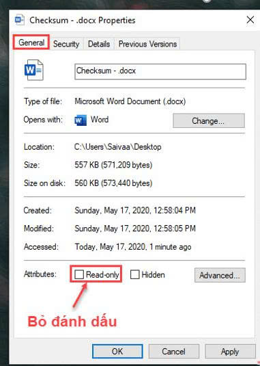 Sau đó, các bạn chọn thẻ General và bỏ đánh dấu mục Read-Only. Cuối cùng, các bạn chọn Apply -> OK để lưu lại thiết lập.